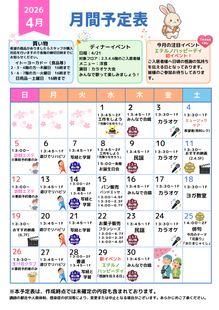 4月は、書道やヨガ教室、カラオケ、映画鑑賞、俳句などの定期プログラムに加え、お誕生日会やディナーイベントなど、季節を感じながら楽しめる企画をご用意しております。